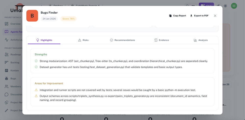 Spotlight: The Bugs Finder Agent While Code Quality checks the structure, the Bugs Finder digs into reliability. In this project, the agent returned a Score of 76%, immediately flagging a moderate risk.