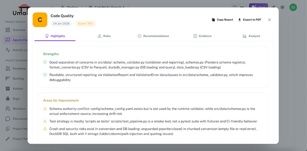 | Agent Feedback | 1–2 min | Review Scores & Risks (e.g., Code Quality 78%) | Identify urgent technical debt or risks. |