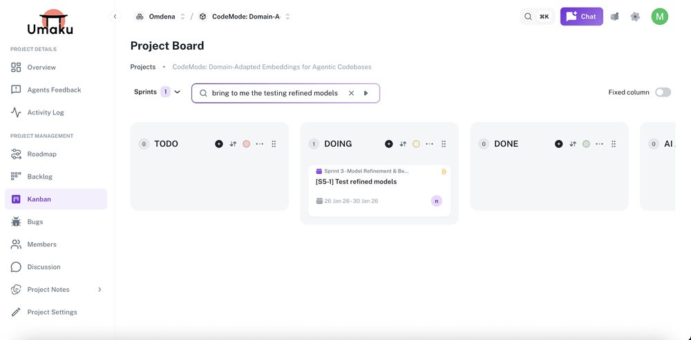 Insight Example: By asking the AI to filter for specific testing models, you instantly see that the task is in the “DOING” column, confirming that progress is being made on the critical path.