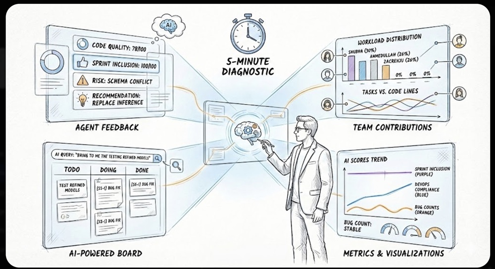 The solution is Instant Agentic Diagnostics. By utilizing an AI-Powered Board, analyzing Team Contributions, and reviewing Agent Feedback you can assess your project’s health in under five minutes.