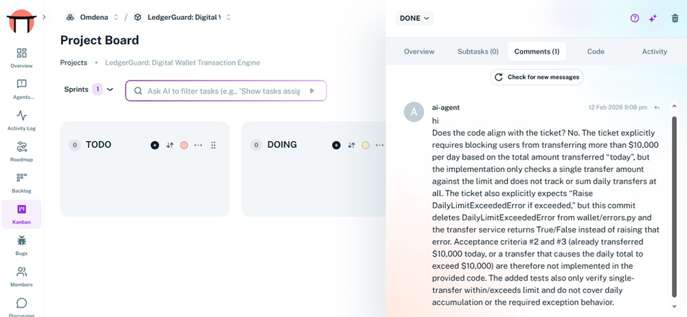 The system retrieved the user story, acceptance criteria, and Definition of Done. It then performed a semantic cross-check between the documented intent and the implemented logic.